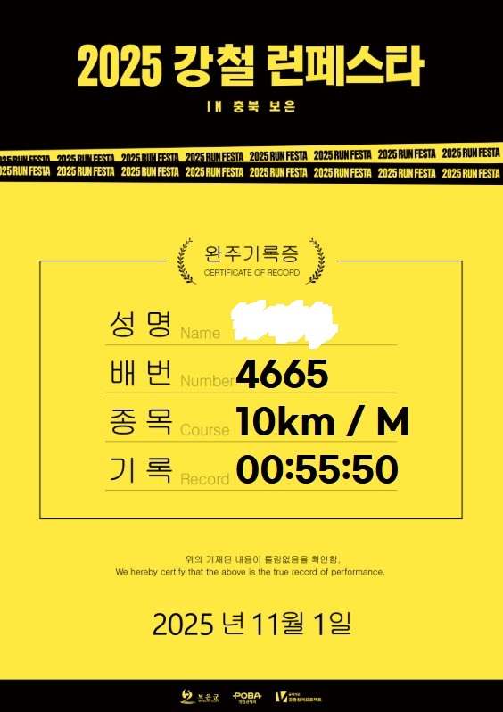 그리고 기록증으로 이번 마라톤을 마무리해 봅니다.
